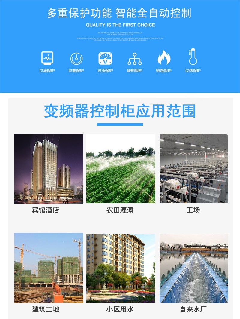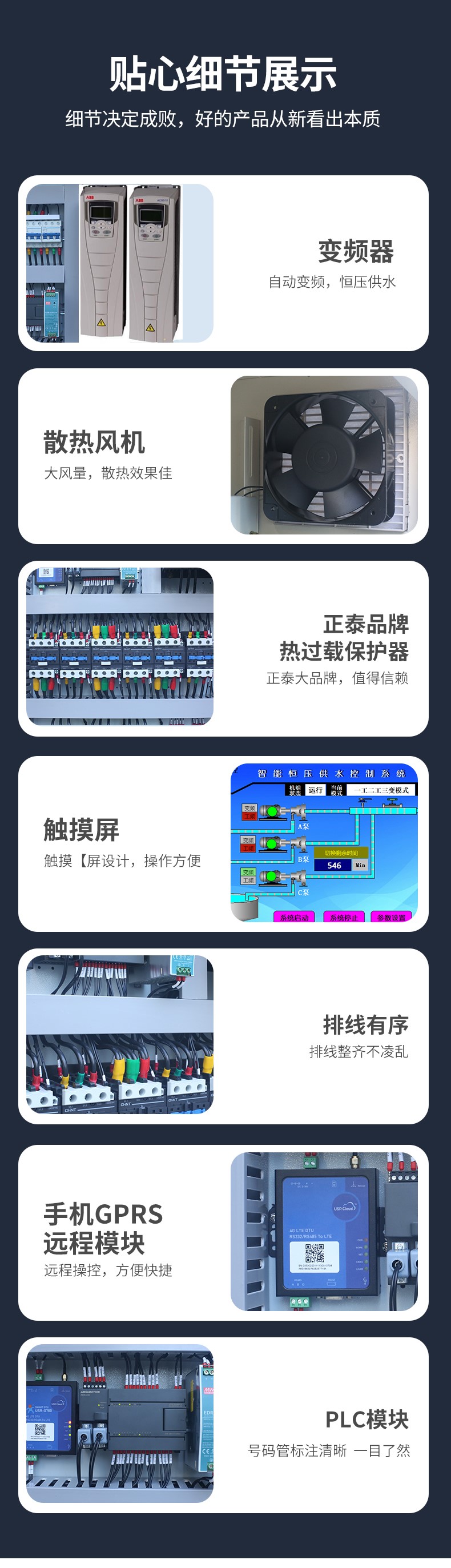 支持多種控制模式(如液位、壓力、溫度、時間控制),具備自動巡檢、故障記憶、遠程監(jiān)控、定時換泵、小流量休眠等功能,減少人工干預,實現(xiàn)無人值守 。