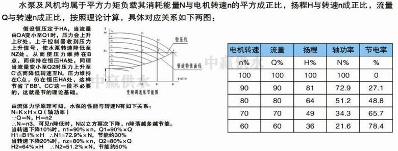 HBW無負壓供水設(shè)備與自來水輸水管網(wǎng)直接串接,可以充分利用自來水管網(wǎng)原有的壓力;采用節(jié)能智能變頻控制技術(shù),設(shè)備的電機泵在微機控制下,根據(jù)自來水的壓力來調(diào)節(jié)電機的轉(zhuǎn)速,只對自來水的進水壓力和所需壓力的差進行補壓,不做無用功,節(jié)能效果顯著,與傳統(tǒng)設(shè)計的采用常規(guī)繼電接觸器控制的給水設(shè)備相比,節(jié)電可達20%60%以上。其節(jié)能分析如下:
