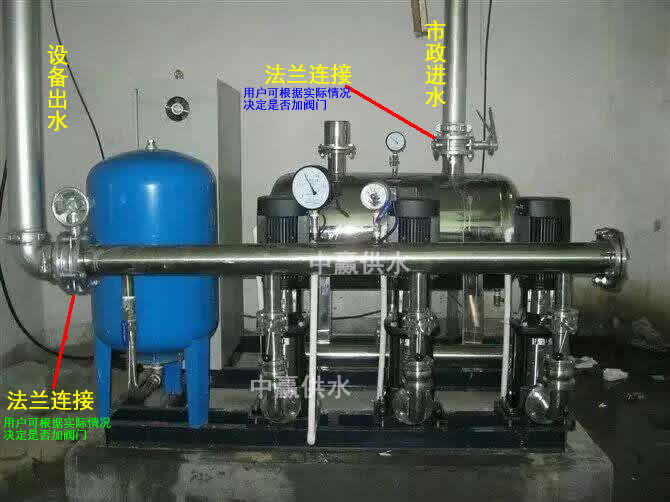 1、設(shè)備進(jìn)水:不銹鋼水箱或自建水池的出水法蘭對接變頻恒壓供水設(shè)備進(jìn)水法蘭。